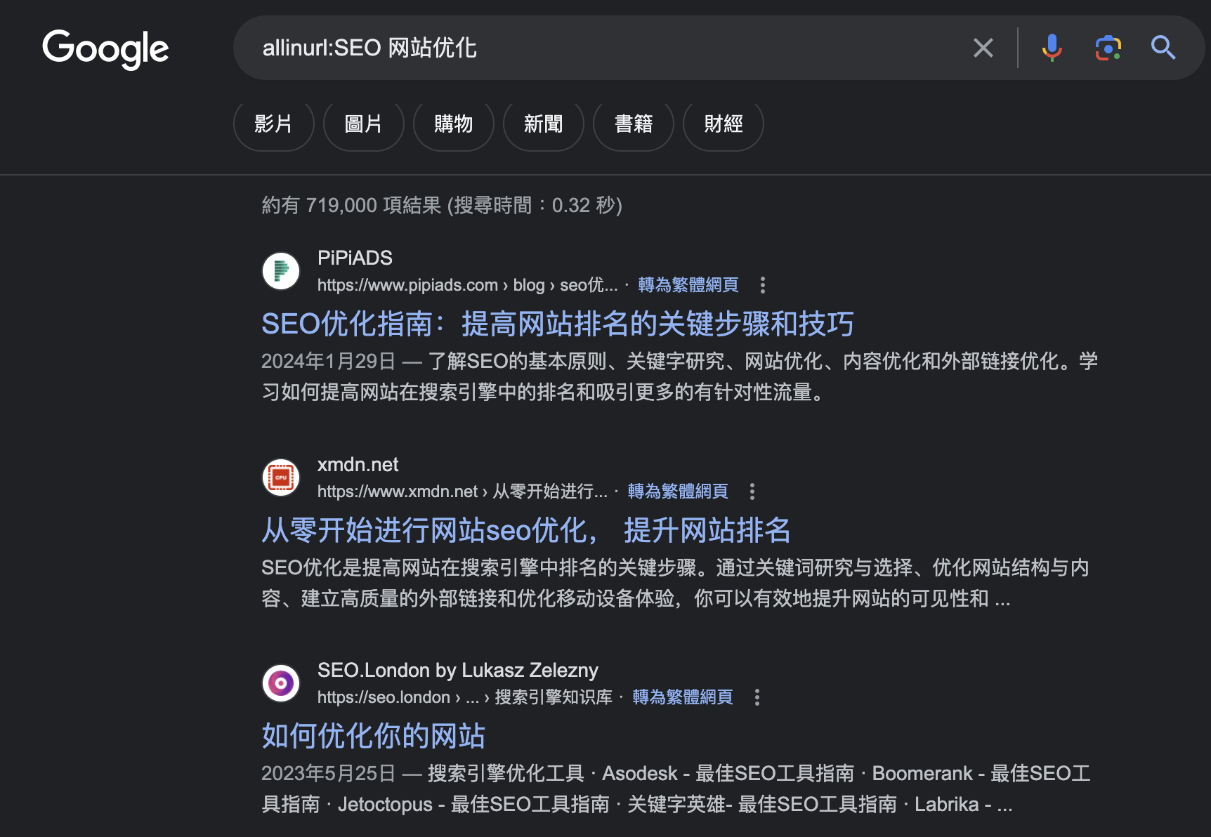 allinurl:SEO 网站优化(与inurl:SEO inurl:网站优化用法类似)